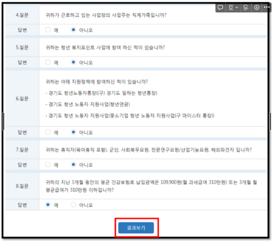 경기도 청년 근로자 지원 사업 웹사이트 메인 페이지에서 ‘청년 복지 포인트’를 클릭하면, 참여 자격 확인을 위한 설문조사가 나타납니다. 설문에 세심하게 참여한 후, 결과 보기를 클릭하여 자격 여부를 확인할 수 있습니다. 자격이 되는 경기도 청년이라면, 꼭 신청하여 혜택을 받으세요.