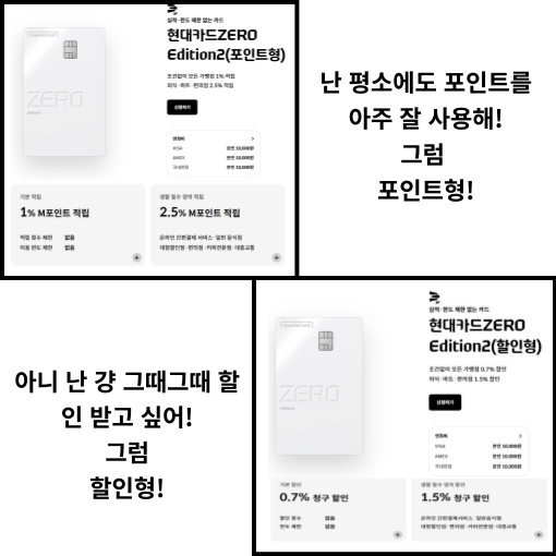 현대카드 ZERO Edition2 카드는 할인형과 포인트형을 동시에 발급받을 수 없으므로 한 가지만 선택해야 합니다.