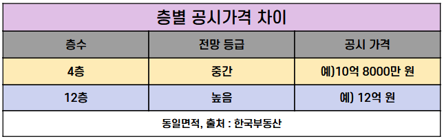 예를 들어, 전용 면적이 150 제곱미터인데 4층은 공시가격이 10억 8000만 원이고, 반면에 12층은 12억 원으로 1억 원 이상의 차이가 있습니다.